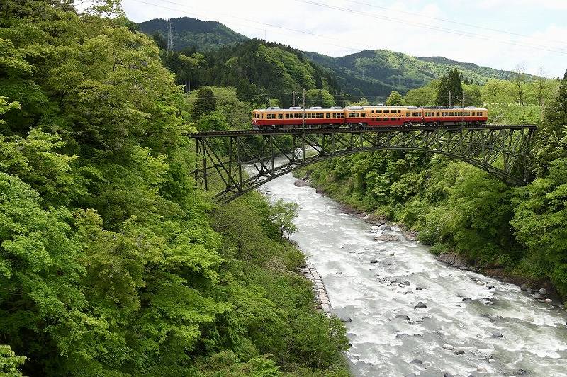 途中合流可能だったので、乗車前に有峰口手前に架かアーチ式橋梁(千垣橋梁)で撮影します。富山地方鉄道を代表する撮影名所。ちょうど新緑の時期で草木も色鮮やか。