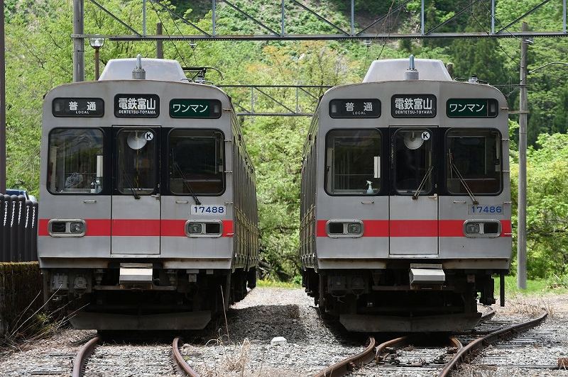 2駅先の立山で車内整備の為乗客は一旦下車。留置線に元東急8050系の現17480系2本がお目見え。撮影会構図です。