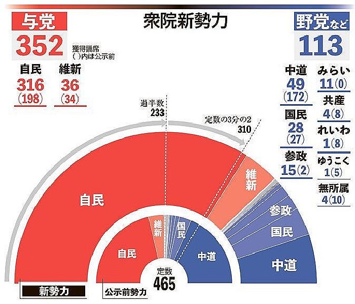 自民党は単独で総定数465の3分の2に以上の316議席を得て、過去最多議席となる歴史的大勝を収めました。