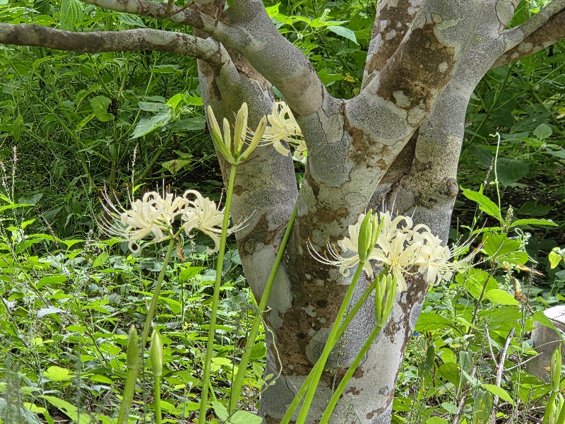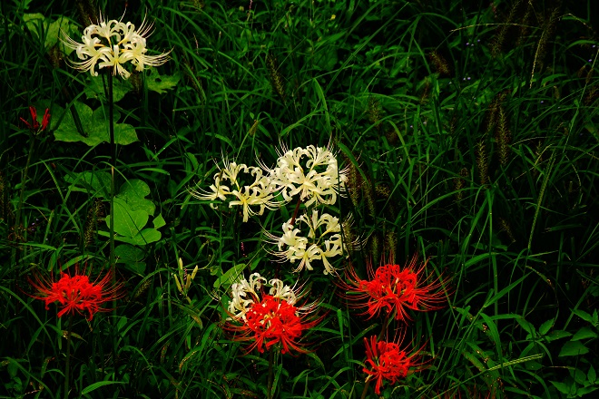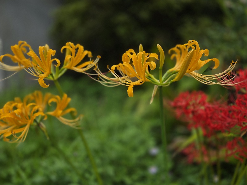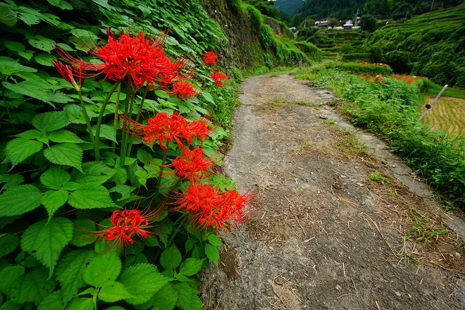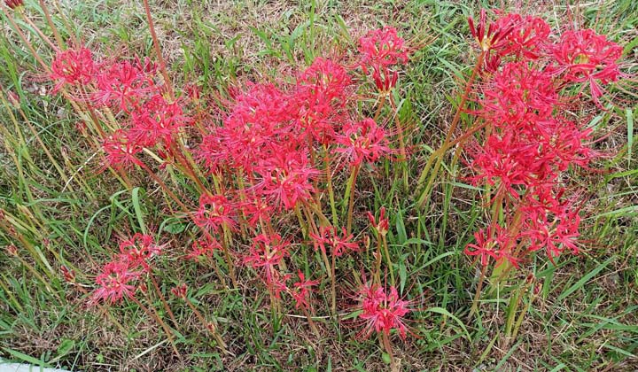 畑の周りの彼岸花が彼岸に合わせて咲き始め、今を盛りと咲きほこっています。