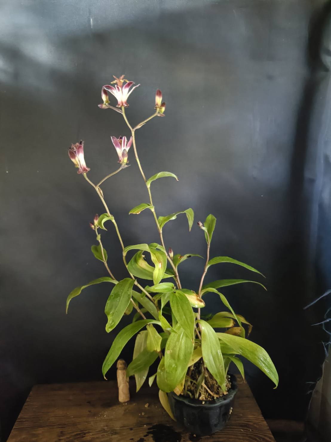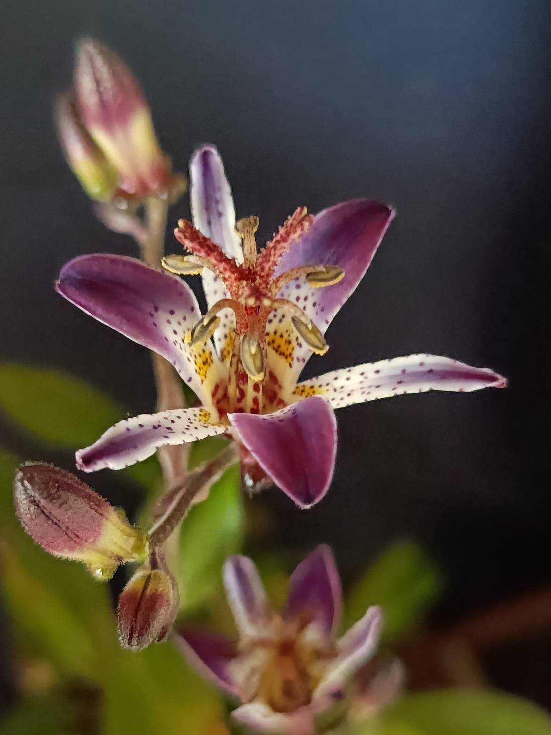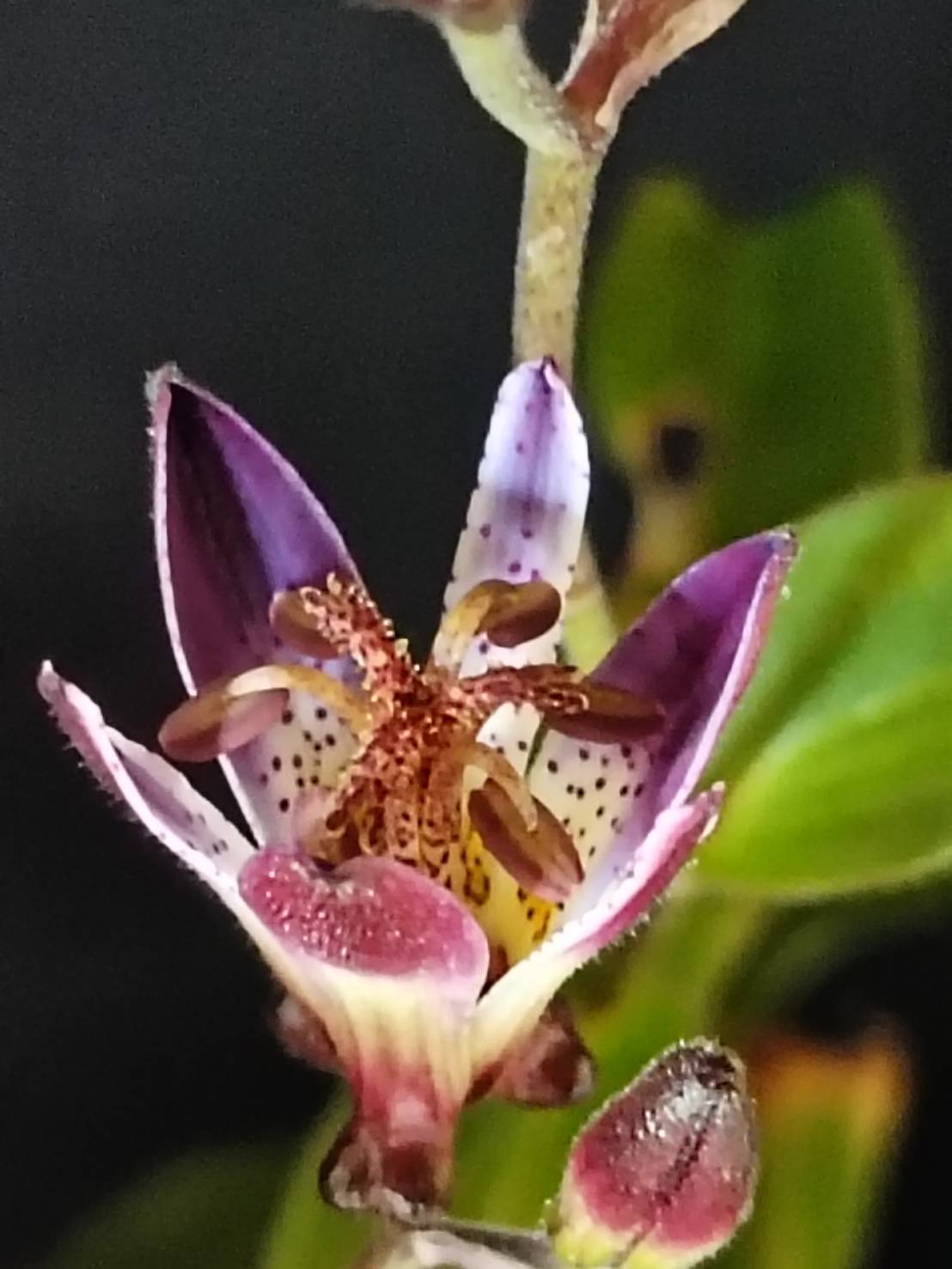花芽は夏頃に見られ、丸くて柄があり、ほぼ下向きに花は新枝の途中から一つずつ咲く、短い柄でぶら下がるように