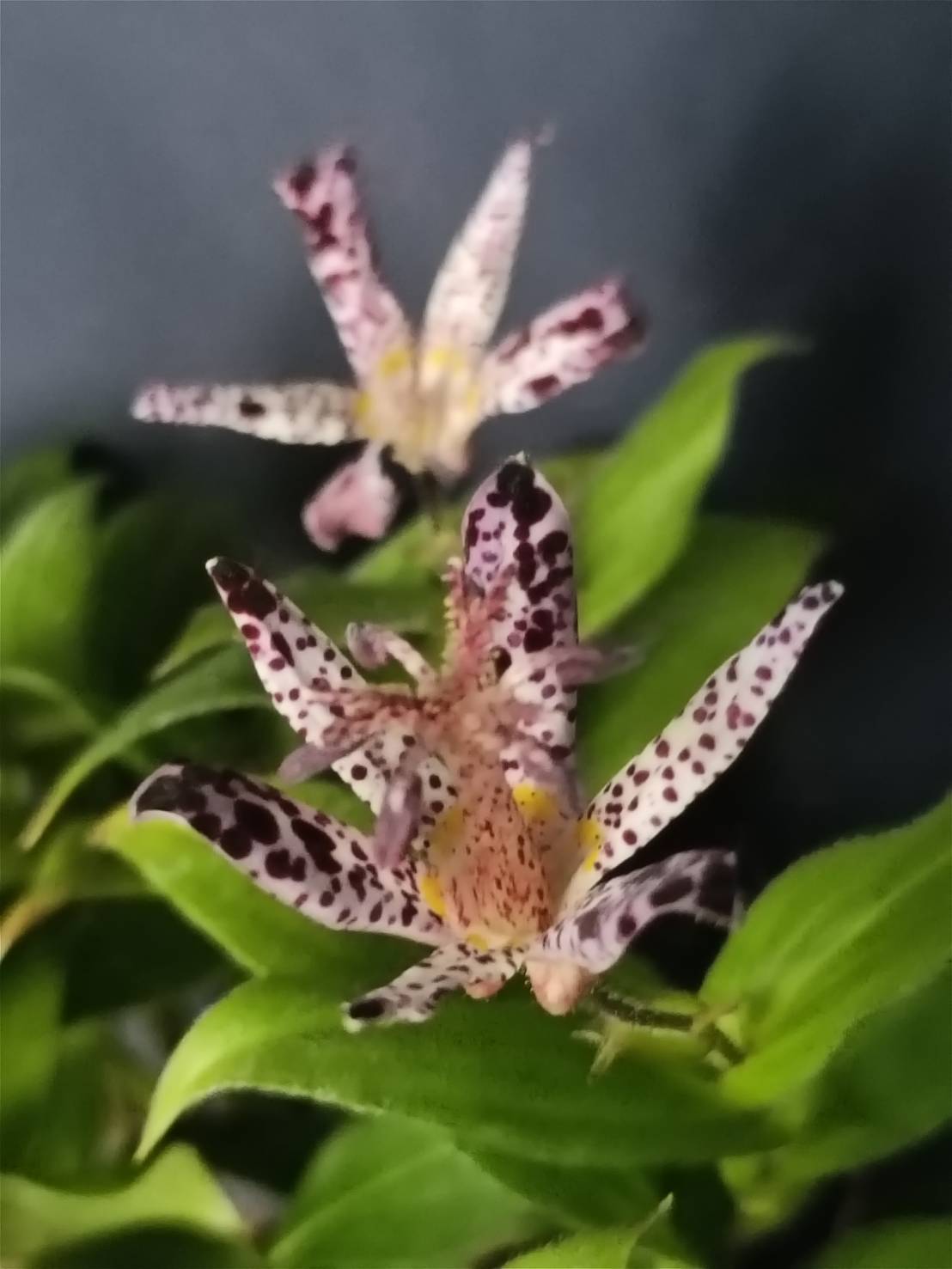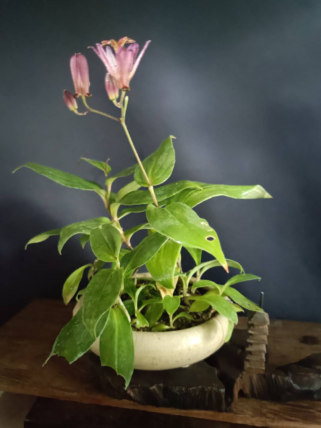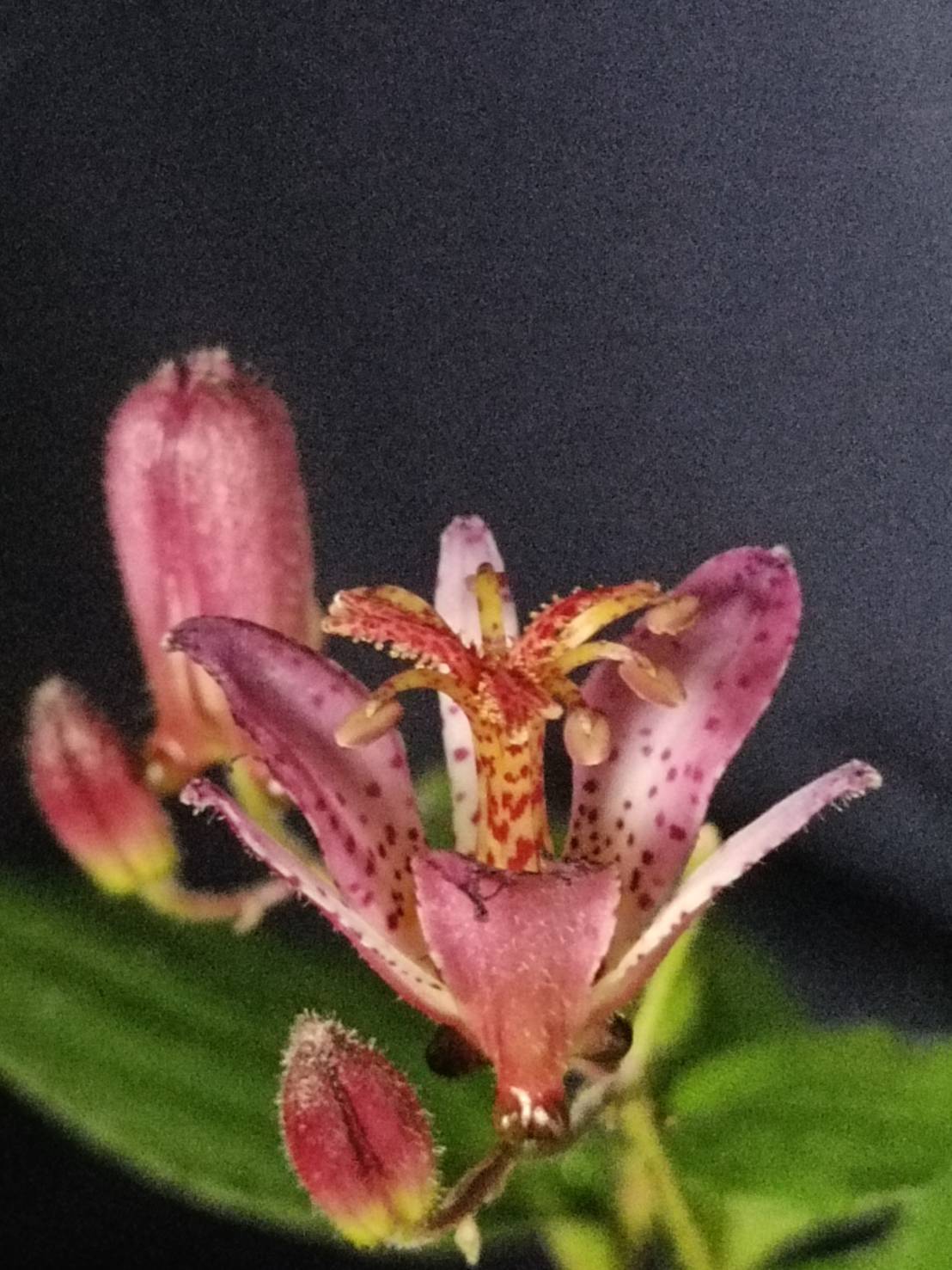 花芽は夏頃に見られ、丸くて柄があり、ほぼ下向きに花は新枝の途中から一つずつ咲く、短い柄でぶら下がるように