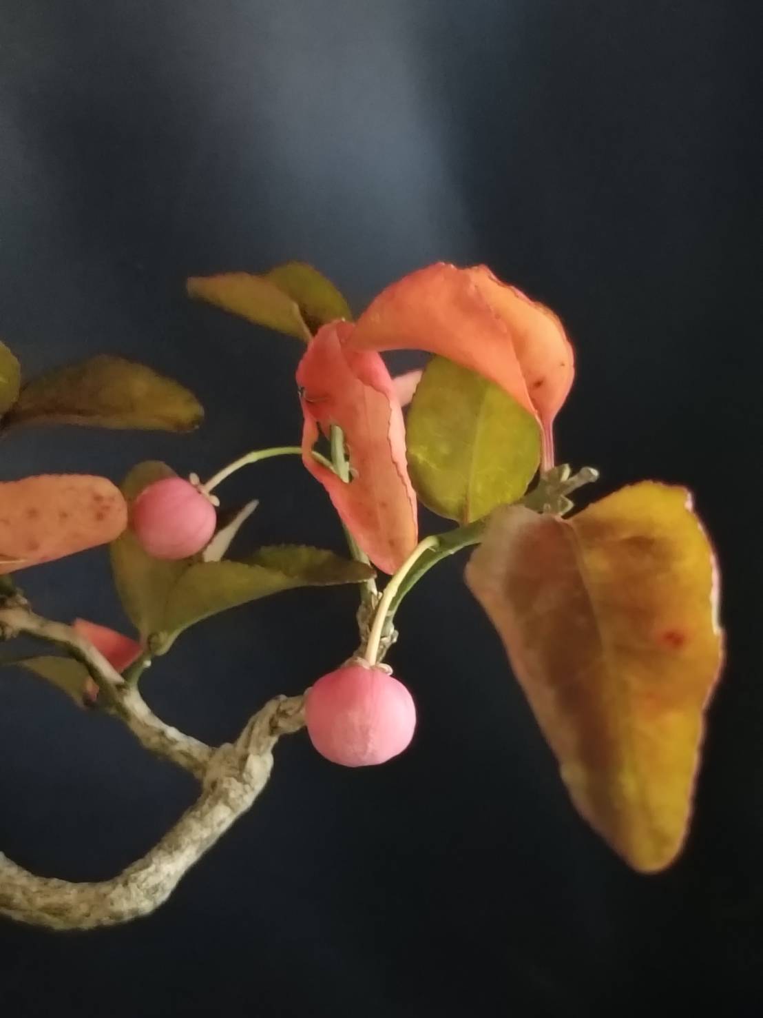 まれ、盆栽にも栽培される。 果実は1p程で4個の稜があり、11月に淡紅色(白もある)に熟す。見所は、熟すと4裂し、橙赤