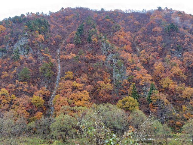 写真2の山頂には白い雪が残っているだろう。一方で、下の方の艶やかな秋色はどうだ!