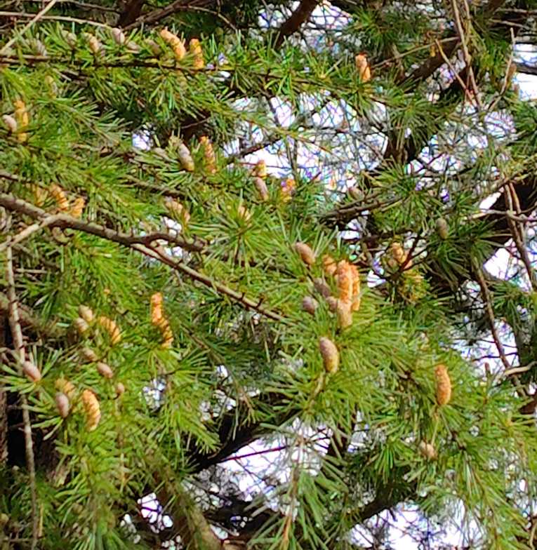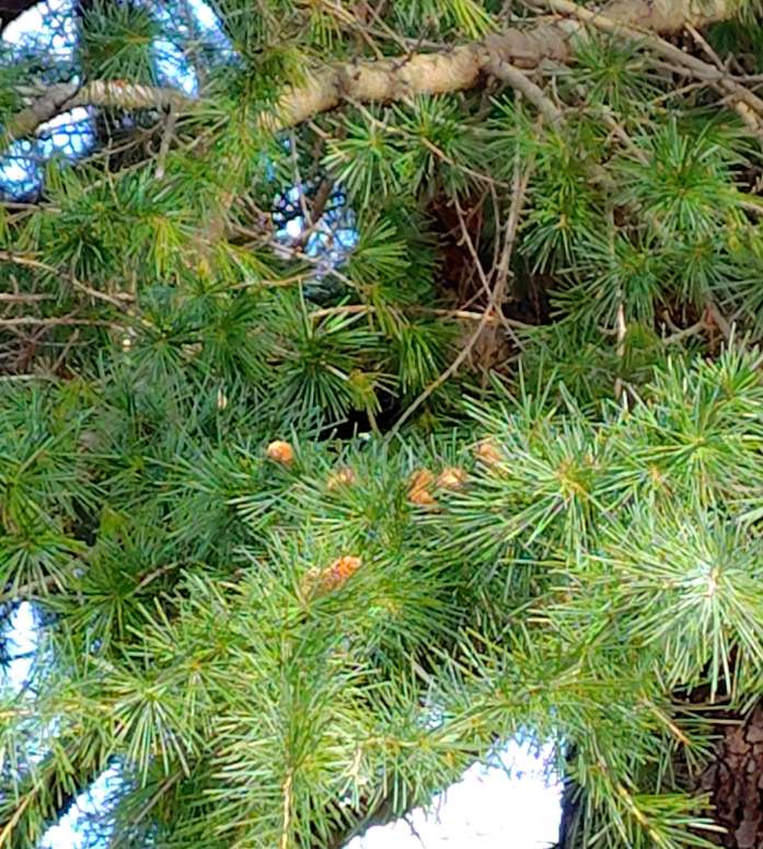 ヒマラヤ杉も葉っぱの色は変化が少ないが、雄花や松ぼっくりには変化が見て取れるよ。
