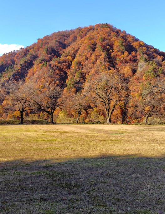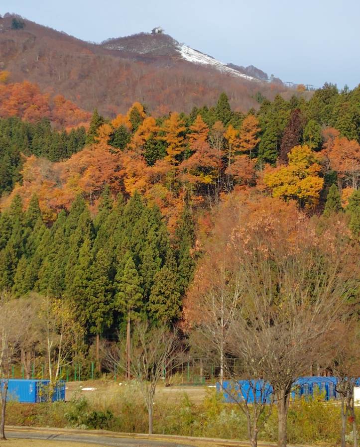 写真1の山の鮮やかさは、周囲の風景に比べて格別に秋の終わりが遅いのだ。グラウンドに雪は、まったく見えないだろう。