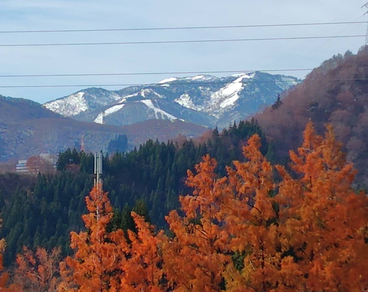 写真1の手前の道路沿いの木々の紅葉は、まだ鮮やかなんだが、奥の方の山には雪が見える。