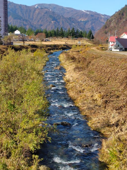 写真2の下流の川沿いの表情も、秋の色合いは完全に冬のくすんだ色合いになってしまった。