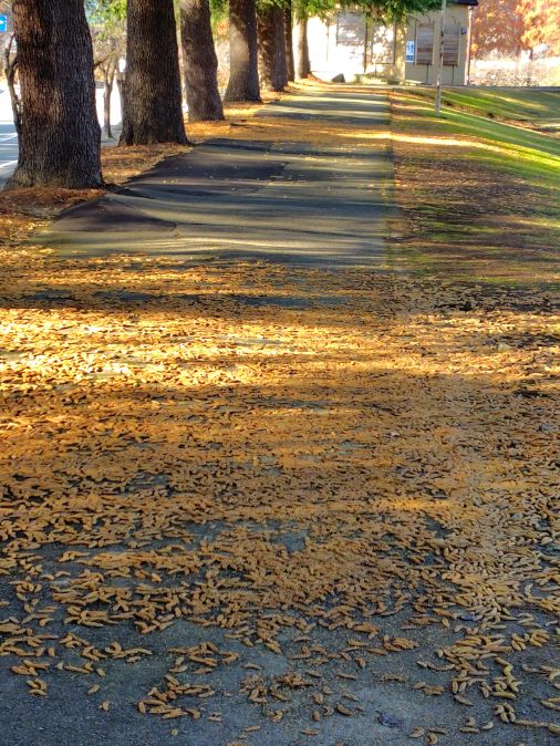 それと今度びっくりしたのだが、写真のように雄花の落下分布が連続しているのだ。