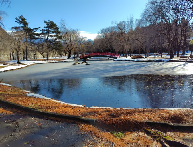 写真1の公園には大きな池があるんだが、その池には薄い氷が張っていた。