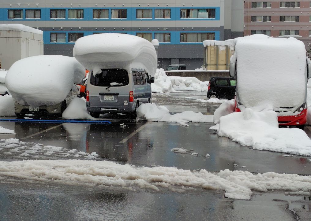 写真1のように、コンビニ前の自動車は一晩止めていたのだろうか、屋根の雪が半端ではない。