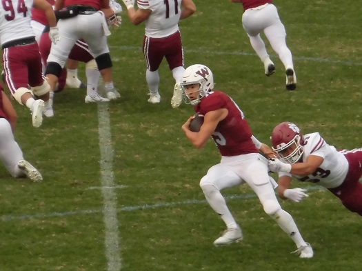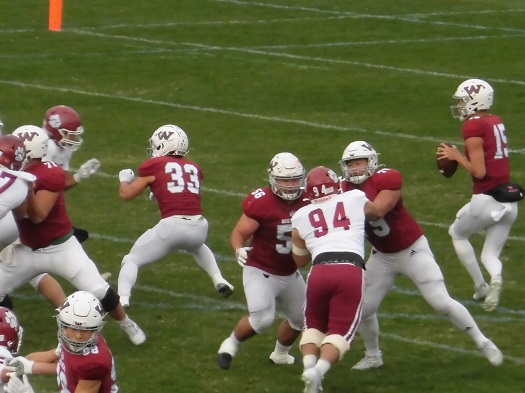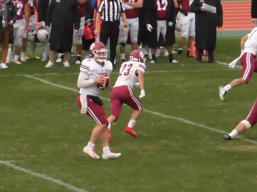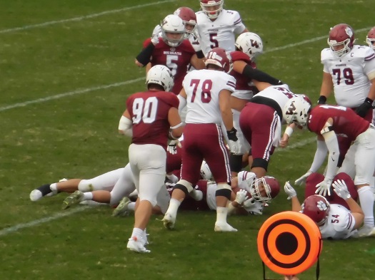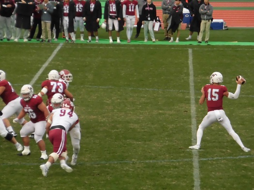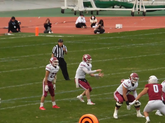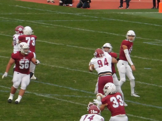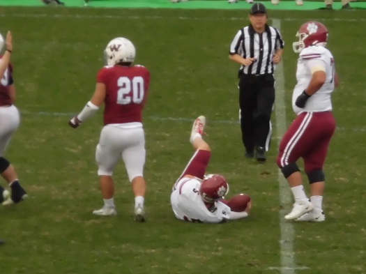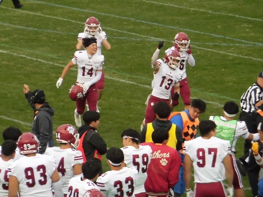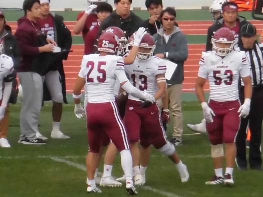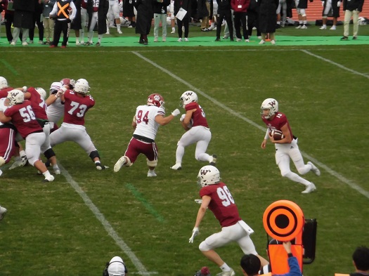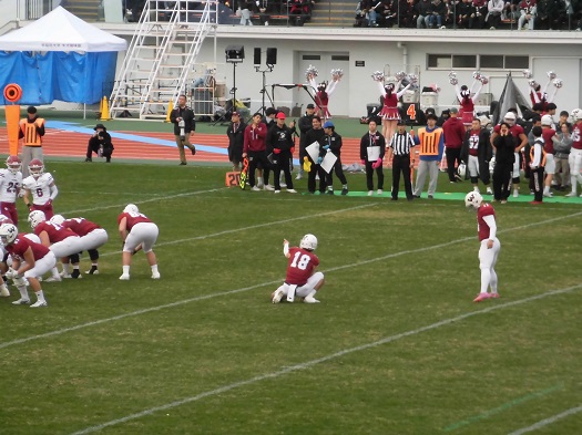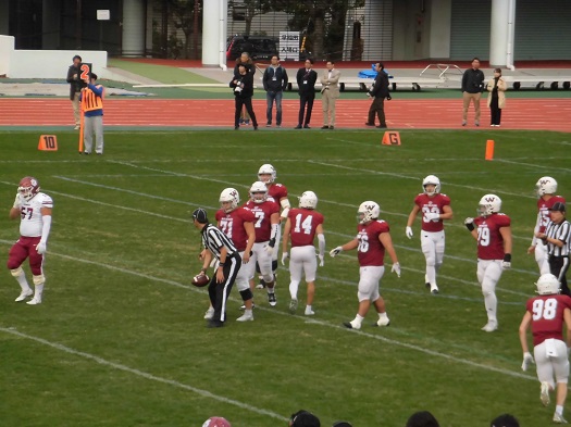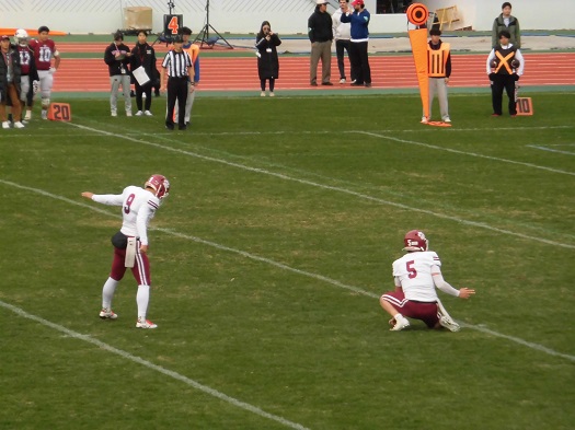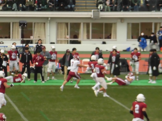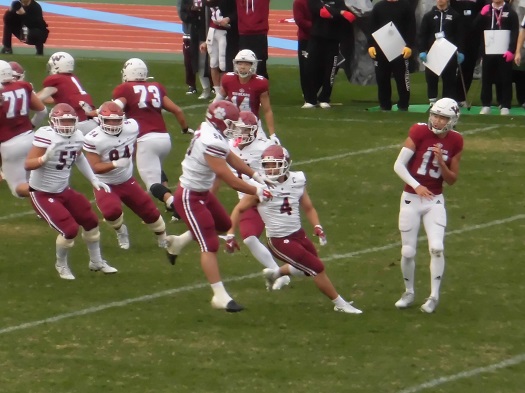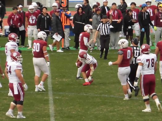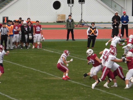 立命FG失敗の結果自陣20ヤードからの攻撃となった早大、ドライブして相手陣内を目指します。