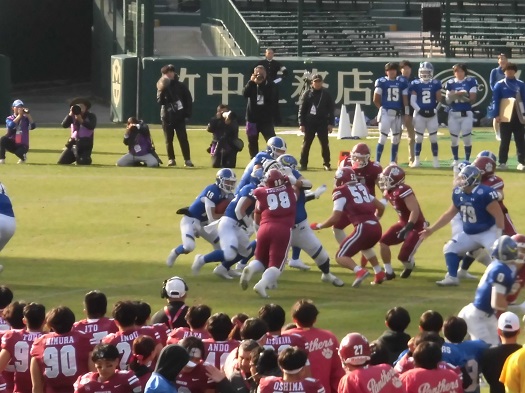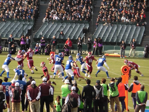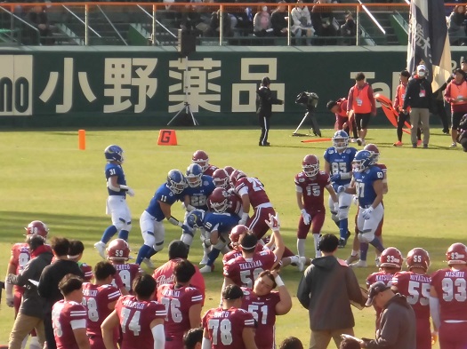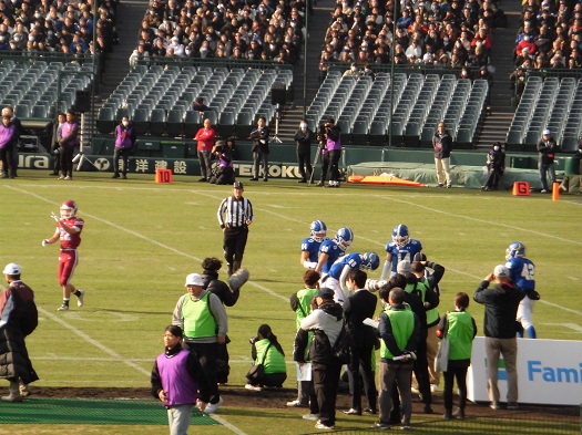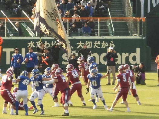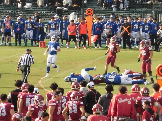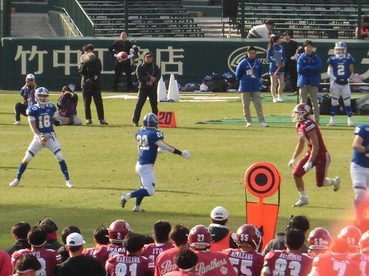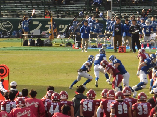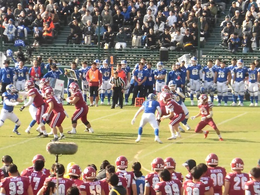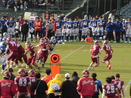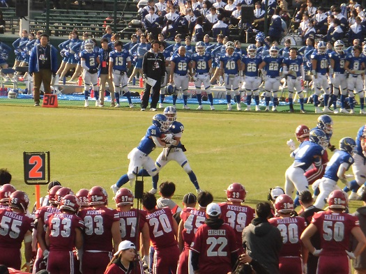オンサイド気味に蹴った関学キックオフを上手く捌き、好位置であるハーフライン付近から立命攻撃が始まります。