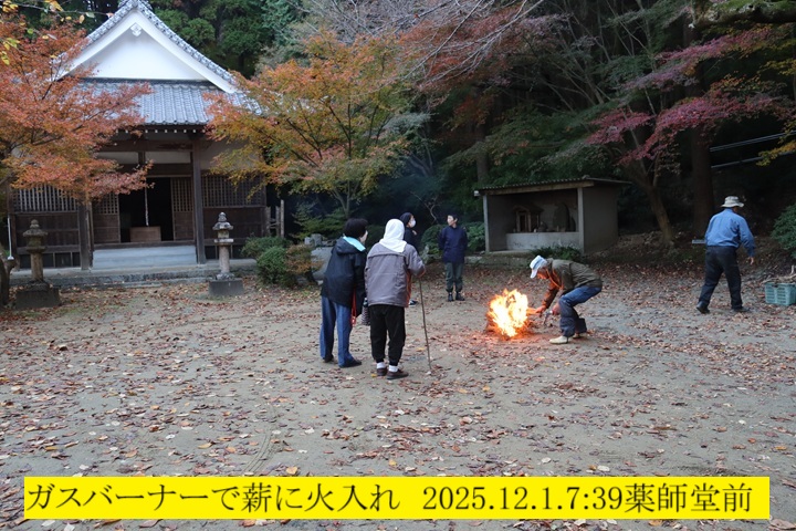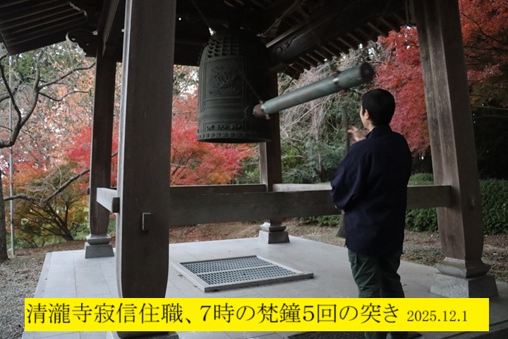 7時の薬師堂横鐘楼で5回突く寂信住職の鐘の音色と同時に到着。古くからの清瀧人
