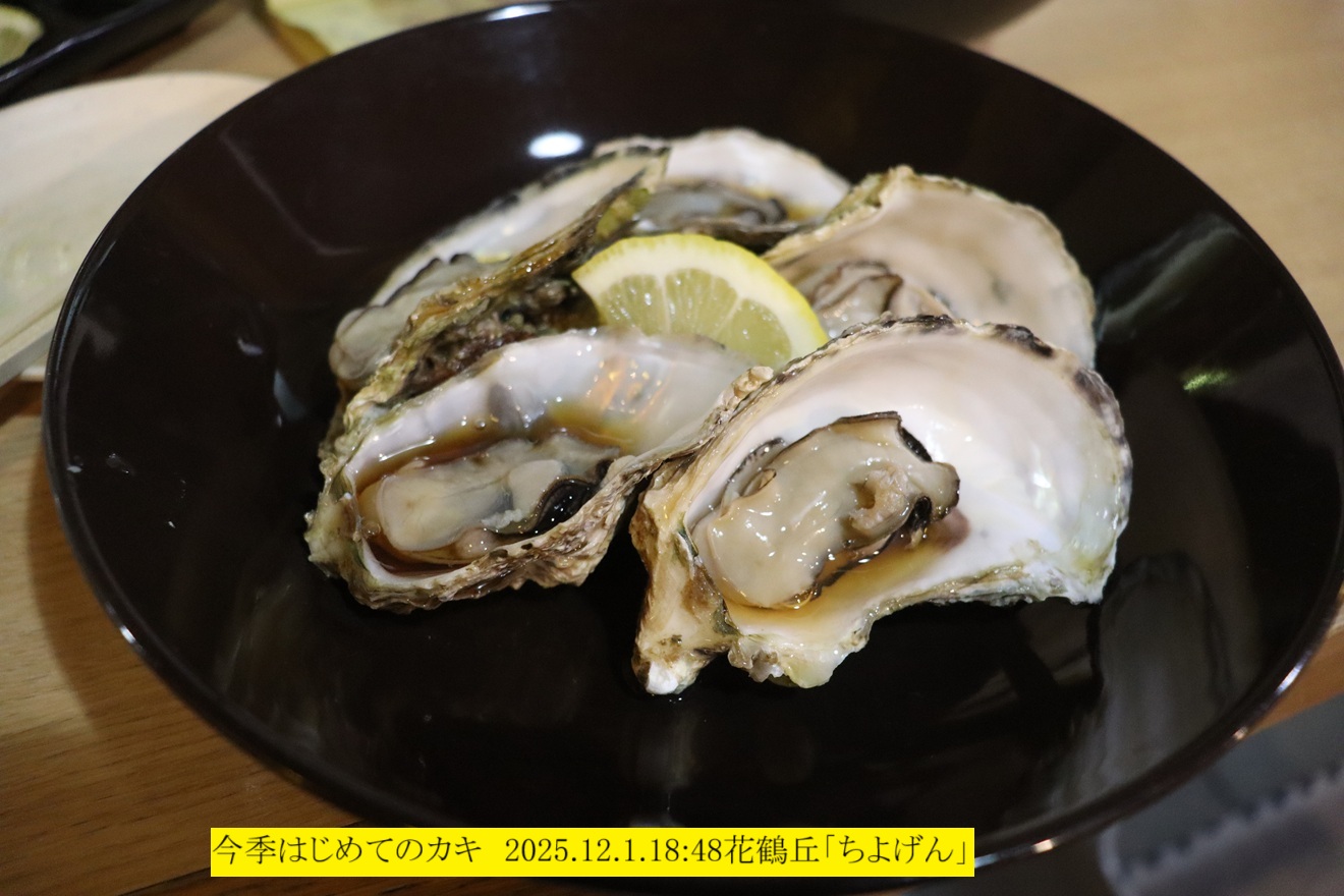 「ちよげん」で独り酒。 あてはお通しの刺身、おでん5点、今季初の海のカキ(画像)。